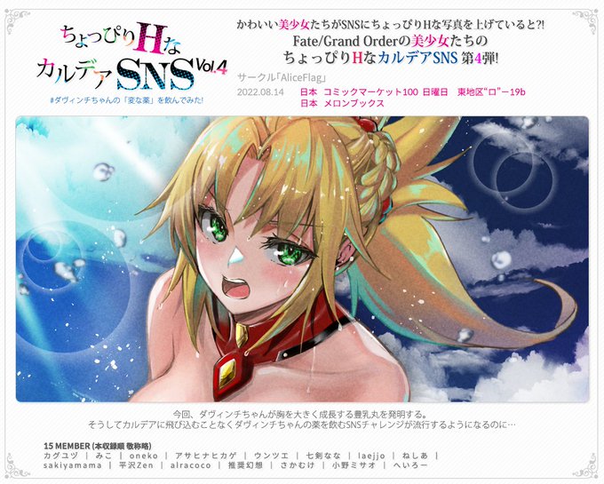 【C100@2日目東ロ-19b】 FGO美少女イラスト合同誌 『ちょっぴりHなカルデアSNS Vol.4』 作家15人が参加した、ちょっぴりHなSNS! ⊙Member紹介: ねしあ(@Neshia0309)様 #C100 #コミケ #夏コミ #FateGO #FGO 本情報▶bit.ly/3BrdM8m メロン▶melonbooks.co.jp/detail/detail.…