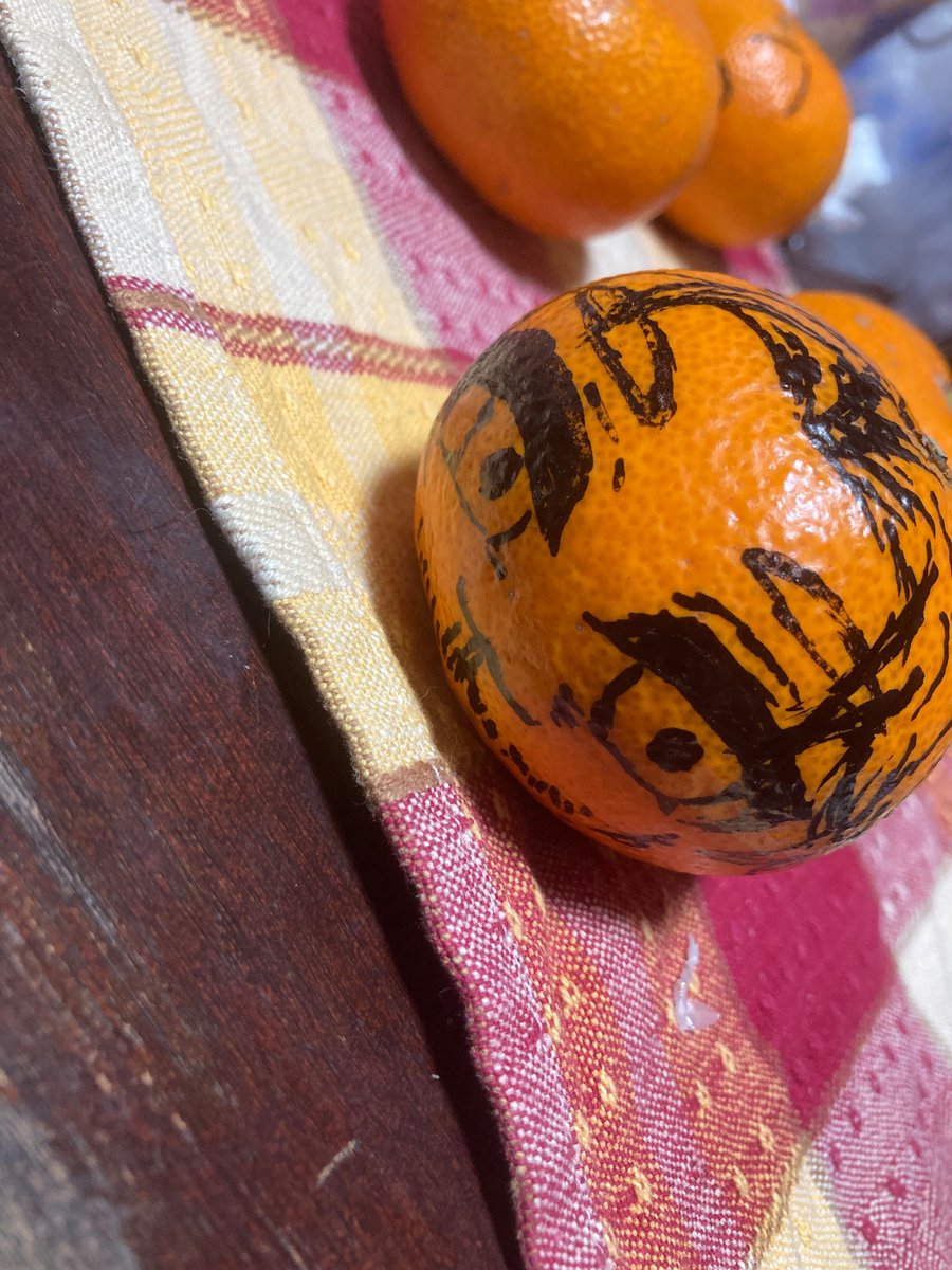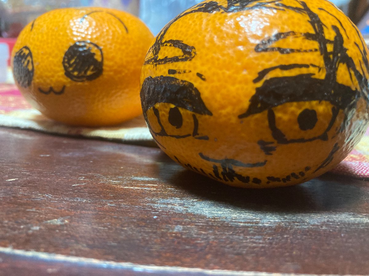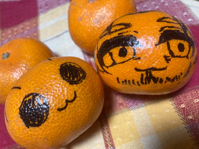 2 18 ミカンにベルさんとオーナー描きました!! あまり見えないけど髪の毛ちゃんと書いてます! ギリギリまでこのまま飾る…… #デラスのお品書き 22/12/22 18:07