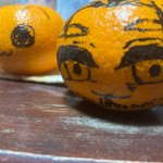 ミカンにベルさんとオーナー描きました!! あまり見えないけど髪の毛ちゃんと書いてます! ギリギリまでこのまま飾る…… #デラスのお品書き