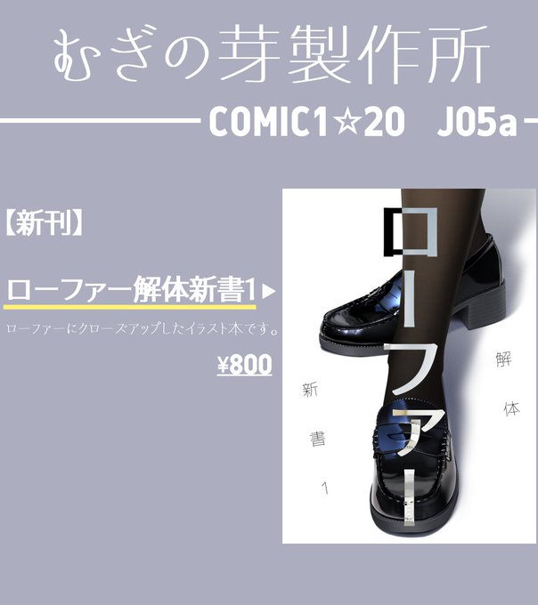 24 36 【告知】むぎの芽製作所から、5月8日開催のCOMIC1で新刊を出します! 【タイトル】ローファー解体新書1 【仕様】B5/16P/フルカラー/800円 【スペース】J05a 描き下ろし込みのローファーイラスト本です!表紙デザインと同じ卓上ポスターを置きますので、ポスターも目印にぜひお立ち寄りくださいませ〜 22/04/24 21:00