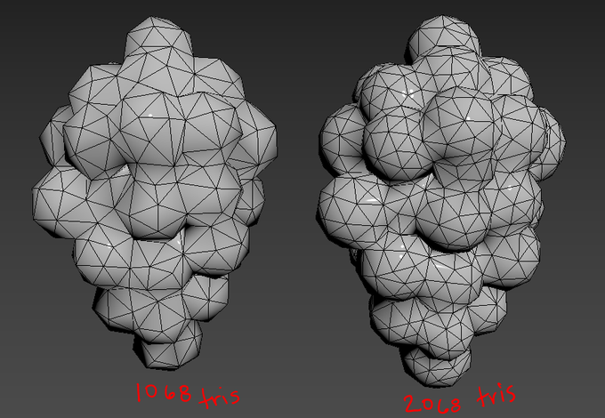 Pondering grapes: Made some real quick/dirty meshes. You quickly see how many tri's you have to get for things to look round and this is too high for something that small. For reference most of the chest gear I've looked at is about 2k tris.🤣🍇 twitter.com/AlpacaAsh/stat…