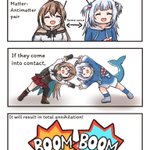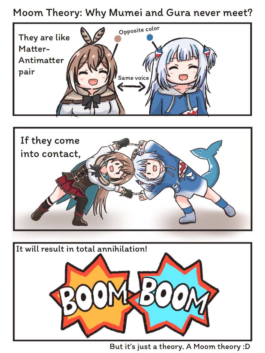 [Moom Month Day 28: Moom Theory] Perhaps the reason Mumei and Gura never meet is that they will go Boom Boom if they come into contact, just like matter-antimatter pairs. But hey, that’s just a theory… A Moom theory :D #drawMEI #gawrt twitter.com/alpha_cas_art/…