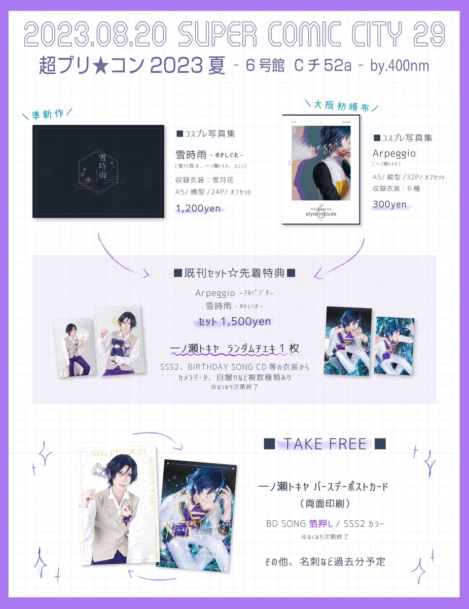 【サンプル②】5/3スパコミ 超プリコン こ56b 既刊◆ Arpeggio 一ノ瀬トキヤ写真集(衣装6種) A5 32p これまでの写真の纏め本です。 色んな表情や表現と、時々デザインを混ぜつつの構成になっております🟣 こちらもサンプル本置いてますので、お気軽にご覧ください! #400nm_Alt twitter.com/alt_toru/statu…