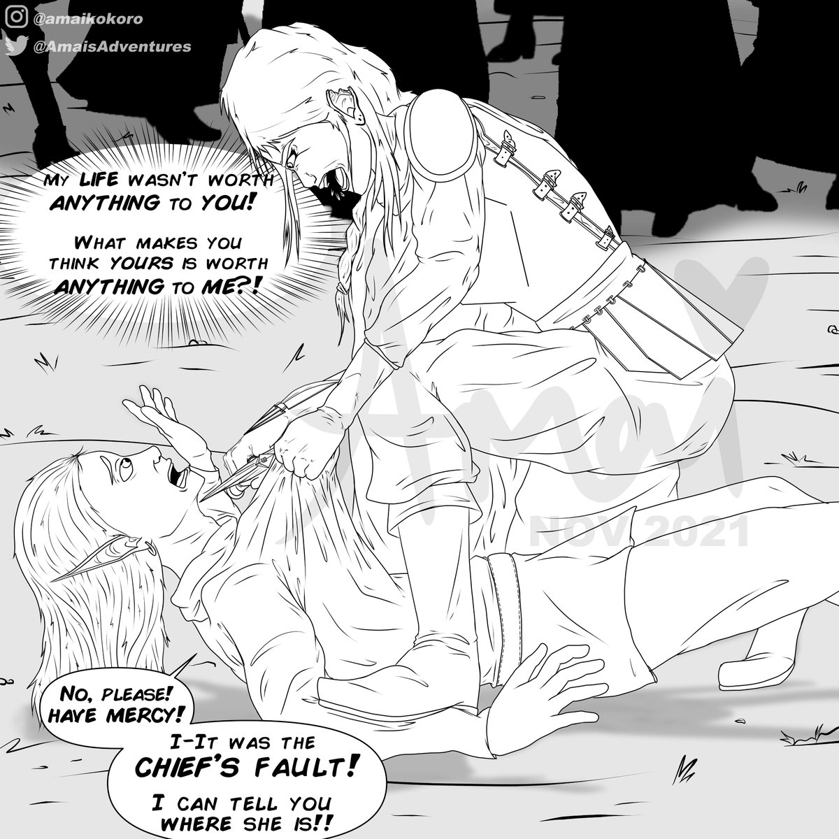An important backstory scene from my #dnd5e game with my Fighter, Hildegarde. An encounter with an elf from her childhood elven tribe set off her PTSD. #DnD #dndart #dungeonsanddragons #tabletop #digitalart #artwork #ocart #originalcharacter #originalart #dnd5e #illustration #art