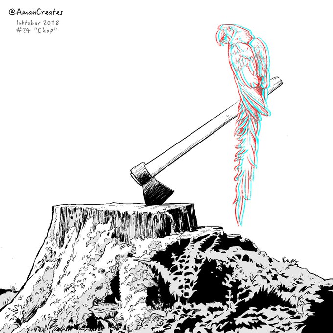 My 24th #Inktober #drawing. "Chop" was the prompt. #Deforestation #EndangeredSpecies #3Dglasses #3Ddrawing #3D #Macaw #Parrot #Rainforest #environmental #conservation #endangered #amazon #environmentalists #climatechange #art #illustration #inkdrawing @UNFCCC @RnfrstAlliance