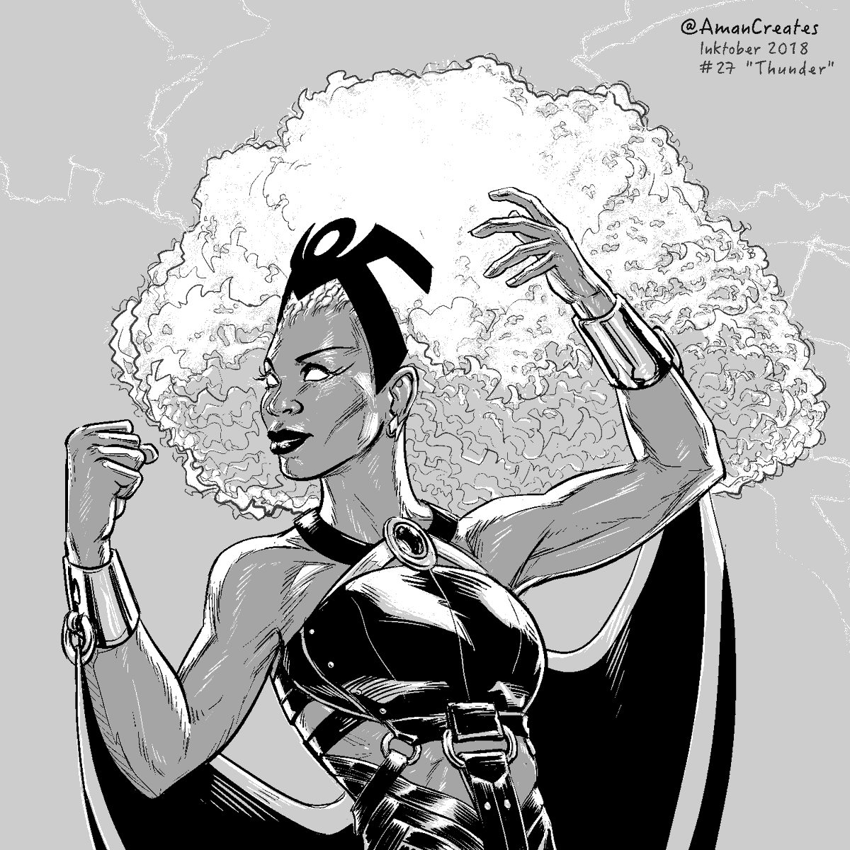 My 27th #Inktober #drawing. "Thunder" was the prompt. #Storm! I wanted to #redesign her #costume and #decolonize her look. Inspired by @MichaelaCoel! #XMen #Ororo #Marvel #characterdesign #afro #naturalhair #woc #blackwomen #MCU #superhero @MarvelStudios @Marvel @MeinerdingArt