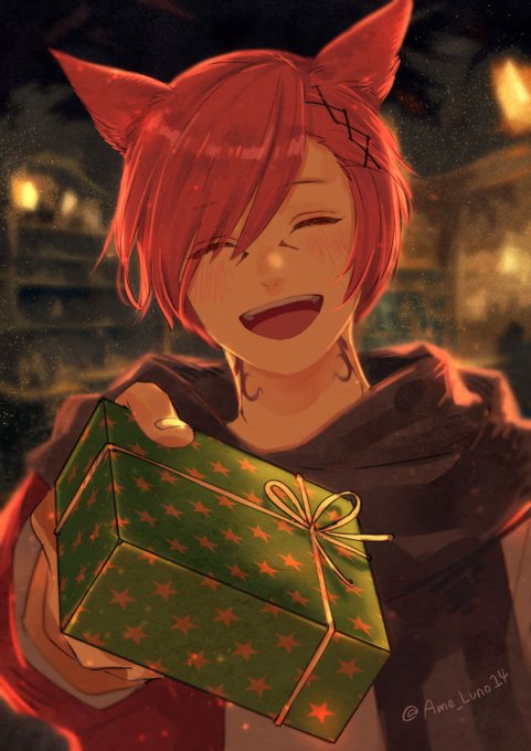 1日中星芒祭のお手伝いして夜中に疲れて帰ってきて遅い夕食取ってたら「良い子には贈り物をあげよう」ってなんかくれるねこちゃん #HappyStarlights! #Grahatia #FFXIVART