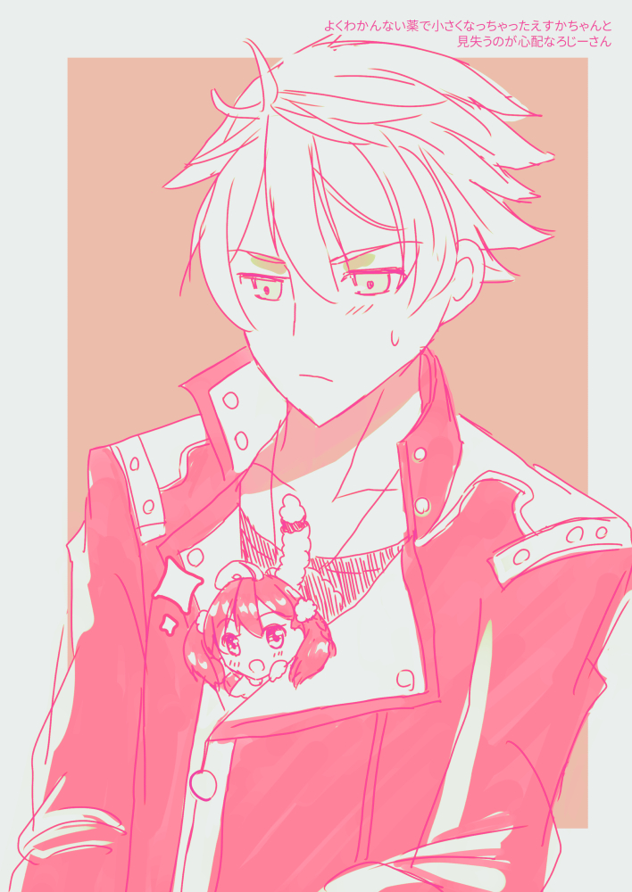 ある日調合に失敗した薬を飲んだら小さくなっちゃったえすかちゃんと、えすかがすぐどっか行っちゃうし見失うとだれかに踏まれるか攫われそうで心配でポケットに入れておこうと思ったけど胸ポケットがないのでとりあえずジャケットの襟のところにいてもらうことにしたろじーさん、という妄想のらくがき