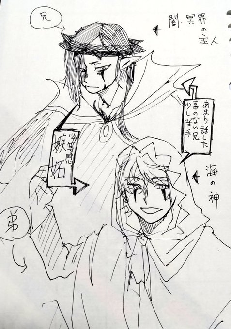 #落書き 創作のやつ ポーセスと兄貴のハディアス 自分よりも遥か上位である海の神となった優秀な弟が憎い。 ポーセスは人間が好きだけれどハディアスは嫌い