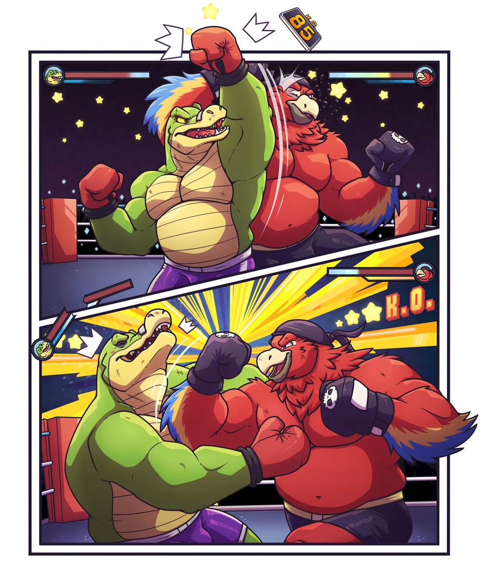 Blow after booming blow has already left @BuckTheBeaw and Jim Simyan somewhat the worse for wear in this slobberknocker of a taped fist bout, but they just keep on sluggin'! And SMACK! A huge left cross from Jim sends Buck reeling! Art by @MerDeKyle7! #BoxingGorillaDay #BuckvsJim