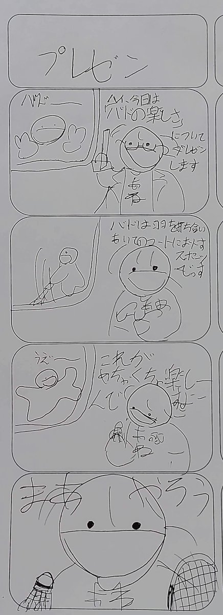 1 47 「プレゼン」 長女作 負けても悔しくてもやっぱりバドミントン🏸が 好きなようです😆👧 #ゆるい絵 #四コマ漫画 23/07/02 23:01