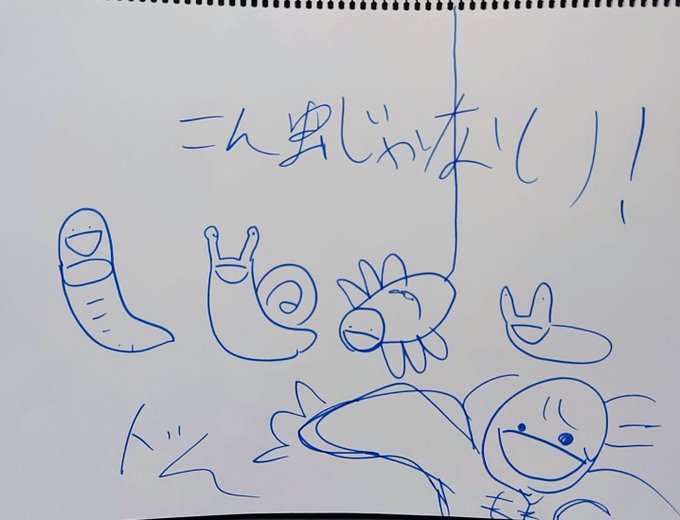 「こん虫じゃない!」 長女作 👧言っておくけど ミミズもカタツムリ🐌もクモ🕷もナメクジも昆虫ではないからね!と力説しておりました😄 虫→哺乳類・魚類・鳥類・貝類以外の小さな動物の総称のこと 昆虫→動物「界」節足動物「門」昆虫「綱」に分類される生物を総称したものだそうです👧 #ゆるい絵