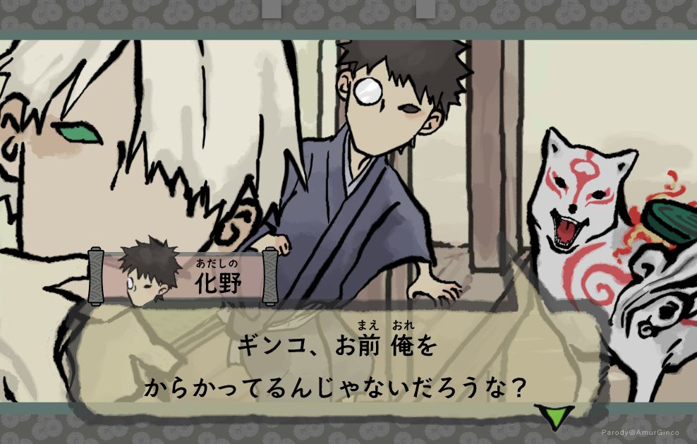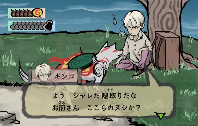 406 947 ⚠️クロスオーバー注意⚠️ 大神×蟲師 ゲーム画面つくるのめっちゃ楽しかったです ギンコのたばこの煙が若干ヒトダマに見えるのが心残り 18/10/09 18:44