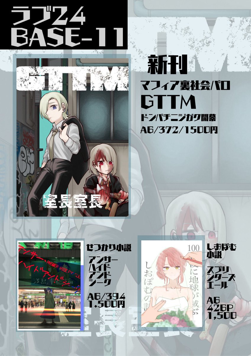 20 19 僕ラブ36、ラブ24でBASE-11は新刊ニジガクマフィアパロ(裏社会パロ)「GTTM」、既刊としてせつかり小説「アンサー・ハイドアンドシーク」しおぽむ小説「スプリンターズエール~100日後に地球が滅ぶしおぽむの話~」を頒布致します。 一律1,500円です。 よろしくお願いします。 23/01/20 12:18