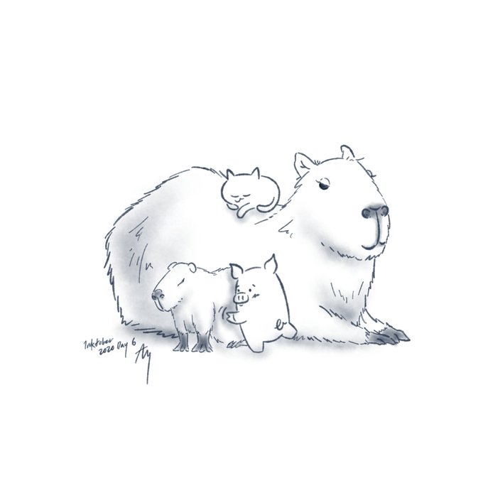 #inktober2020 Day6: #Rodent 🐱🐷Stay tuned #inktober #hkgirl #drawing #illustration #digitalart #procreate #challenge #character #香港插畫 #イラスト #ink #animals #piggy #cat #capybara #水豚 #hug #aay