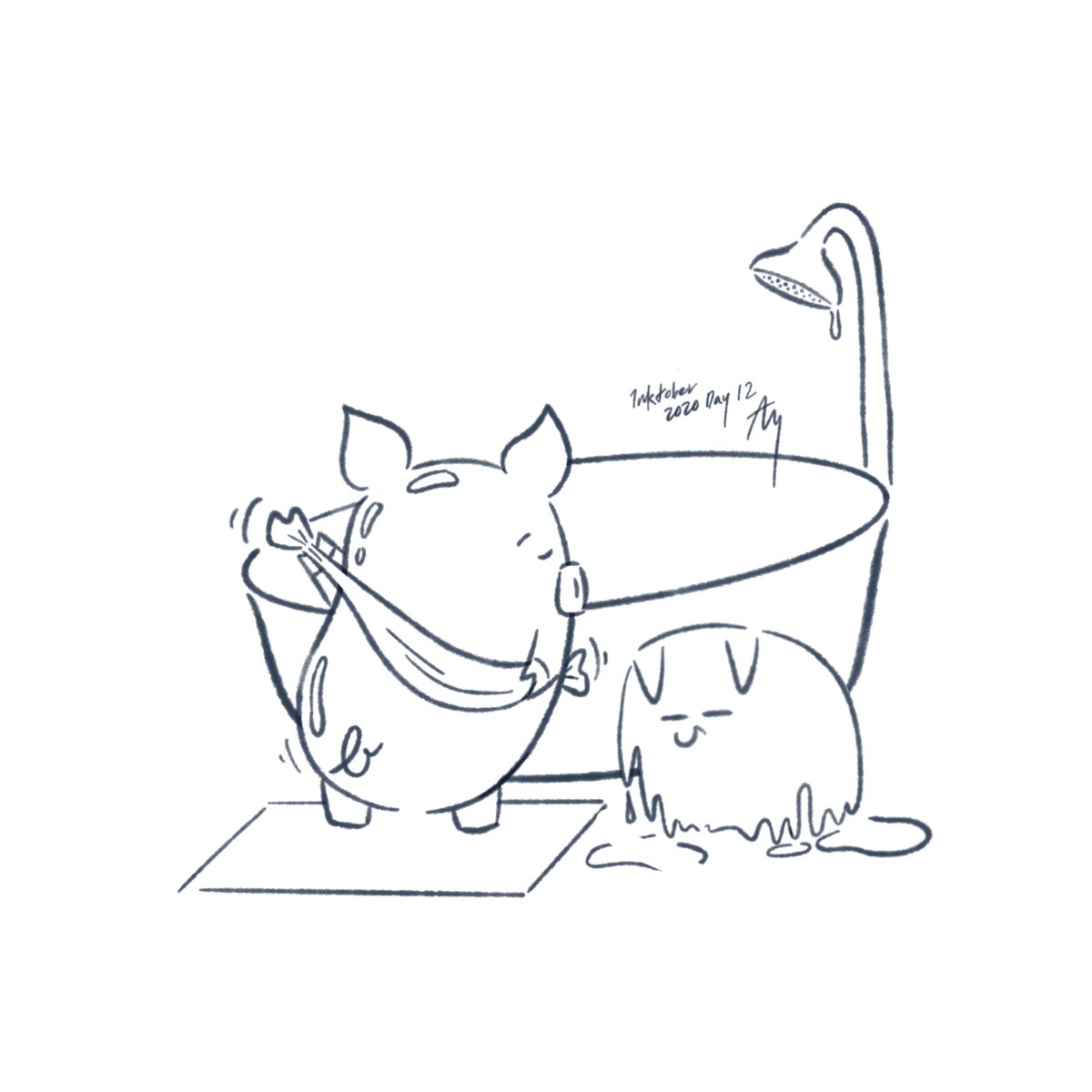 #inktober2020 Day12: #Slippery 🐱🐷Stay tuned #inktober #hkgirl #drawing #illustration #digitalart #procreate #challenge #character #香港插畫 #イラスト #ink #animals #piggy #cat #bathing #wet #clean #aay