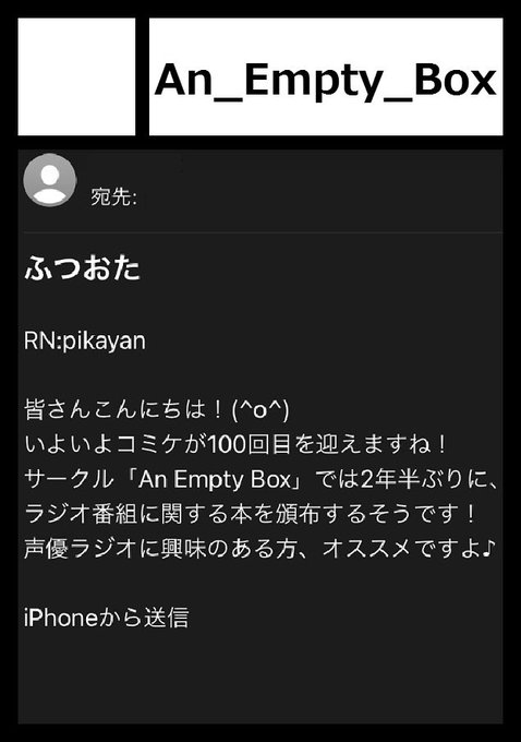 ぐえー! コミケ受かってしまった…! 進捗ダメですガチで何も出来てません頑張ります無理 #コミックマーケット100 #コミケ100 #C100 あなたのサークル「An Empty Box」は、コミックマーケット100で「土曜日東地区 "ナ " 49b」に配置されました!webcatalog.circle.ms/Perma/Circle/1… #C100WebCatalog