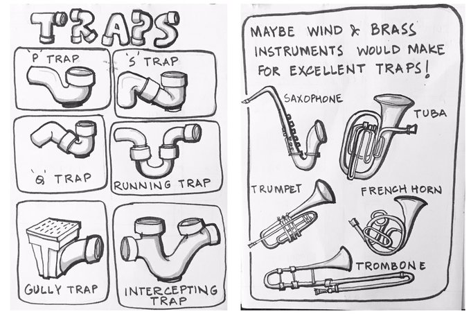 Plumbing traps are designed to trap water to prevent fowl smelling gasses from entering buildings. As the trap bends get more elaborate, I thought maybe brass and wind instruments would make for some excellent traps! #inktobertrap #inktober2020 #inktoberday18 #inktober #plumbing
