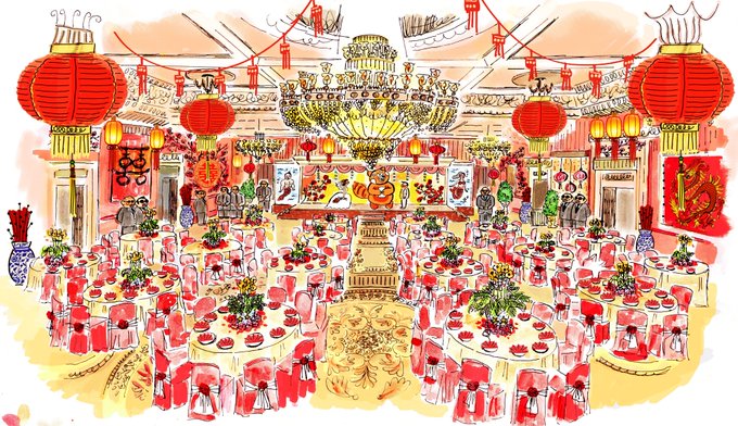 At some point in #TurningRed Fei officiated a wedding at a banquet hall? lol Domee wanted it to be very extra, so I did my best