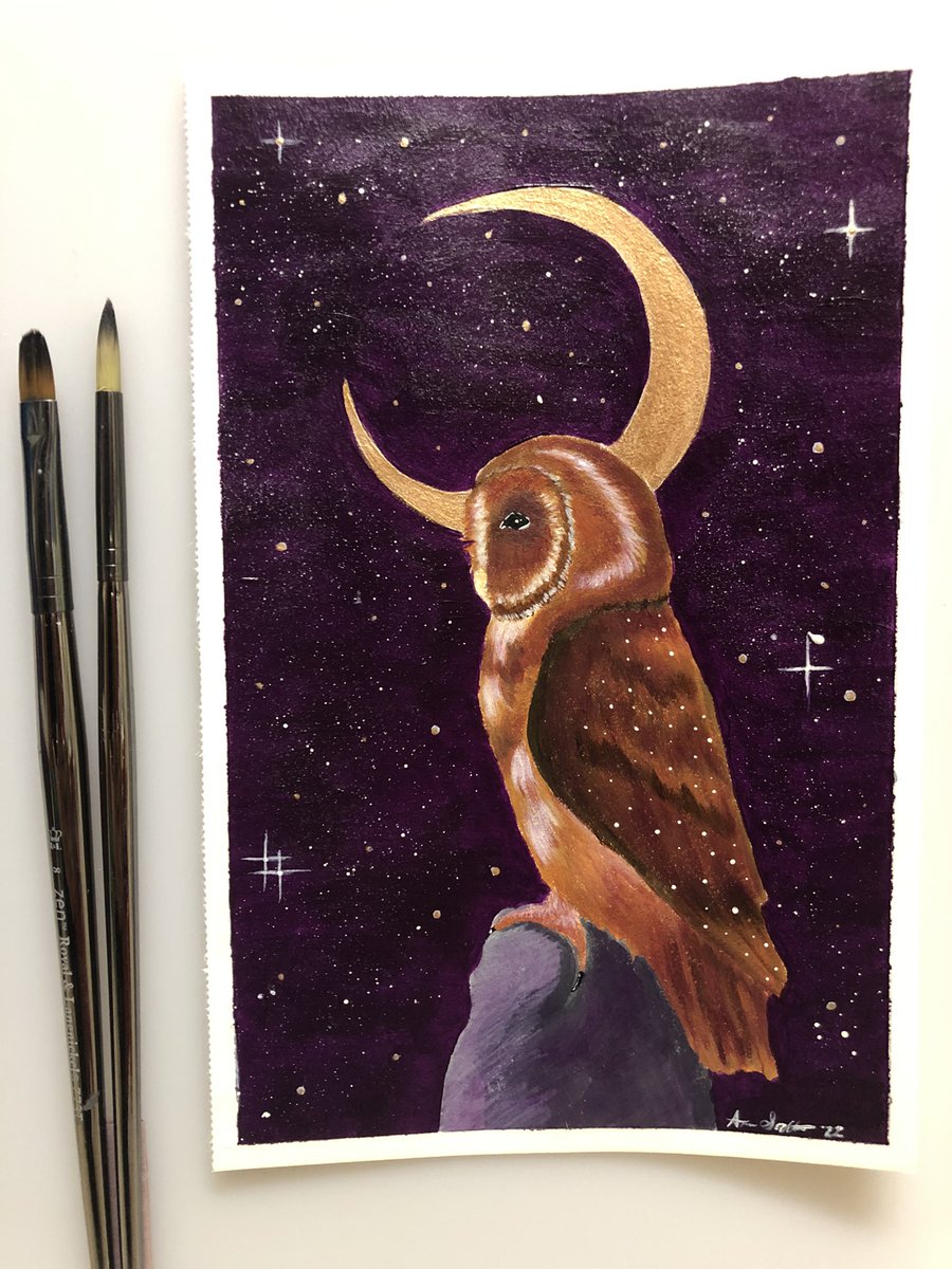 The melanistic barn owl for #AvianAugust2022 The moon and some of the stars are metallic gold.