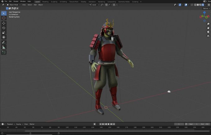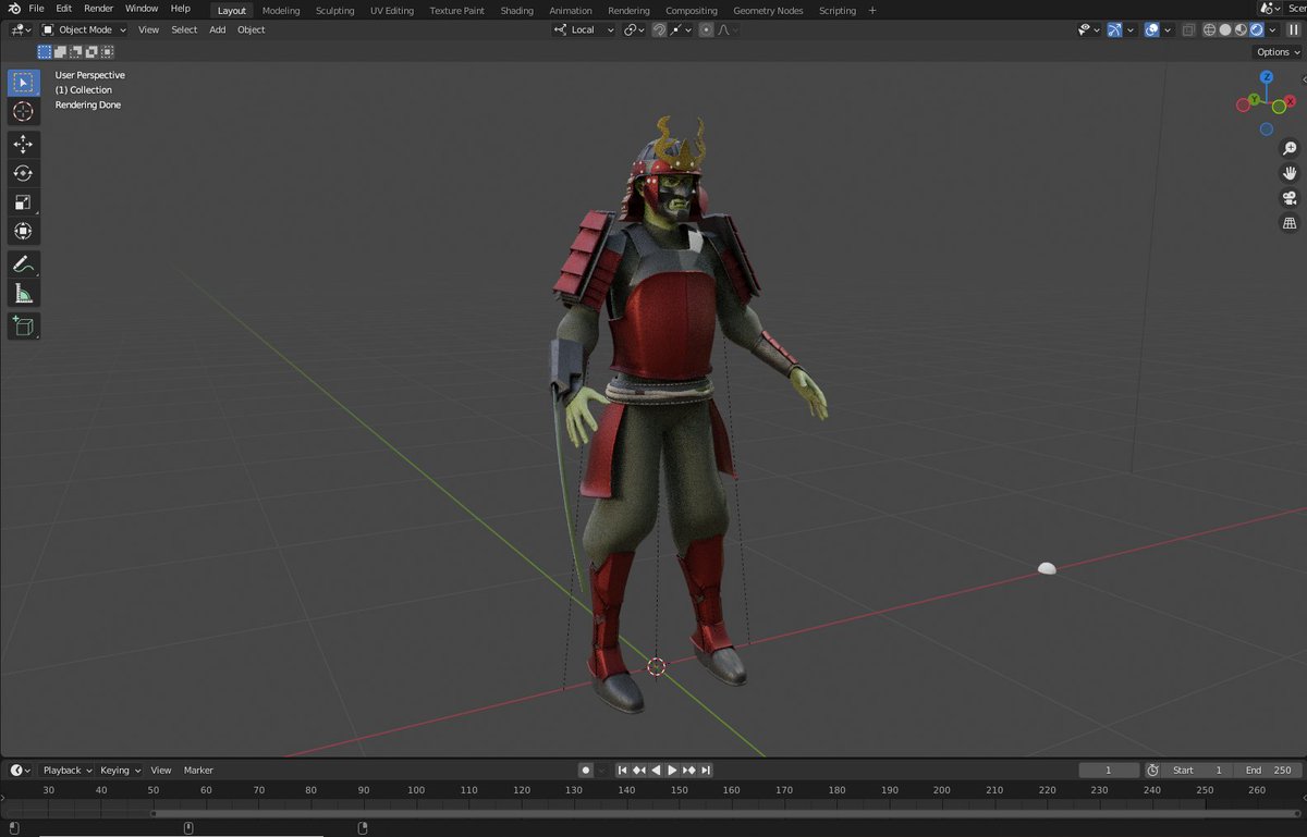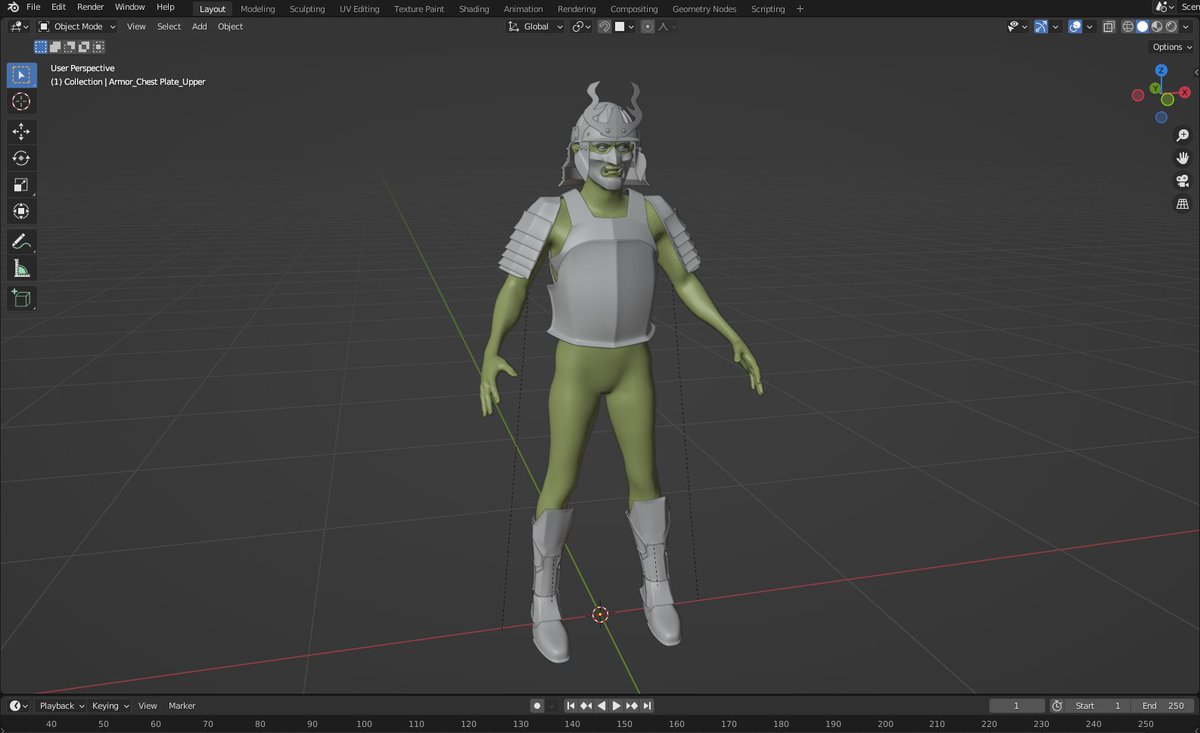 Sneak peek at my DnD character, Alastair, a half-orc Samurai fighter. His armor is a little tricky, due to it being a melding of dwarven and elvish armor styles to mimic traditional Samurai armor, but I think it's turning out well. 😊 #DnD #DnDcharacter #dndart #b3d #Blender3d