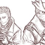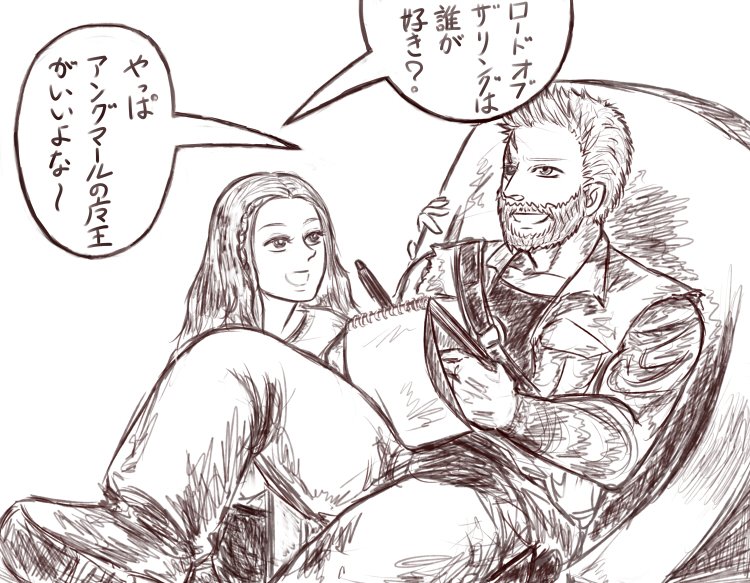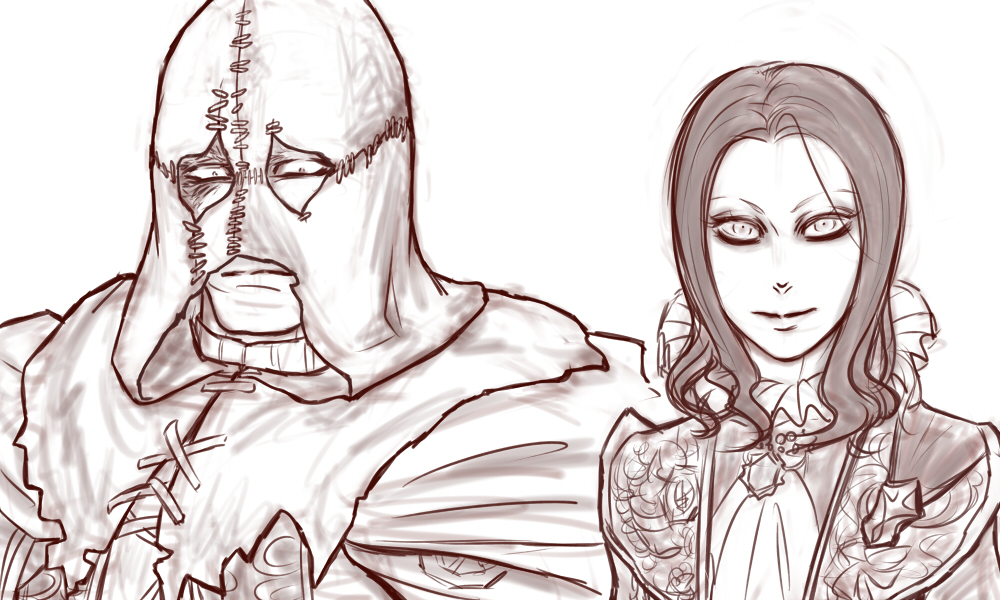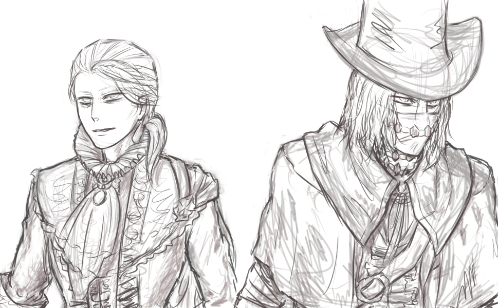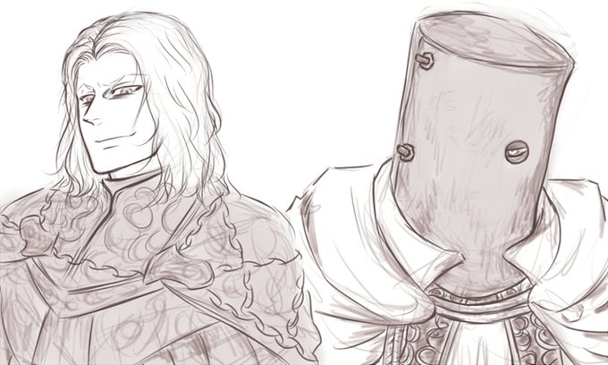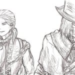 沢山いるブラボ自機の一部を落書きした 左:【Ragnar】右の人の父親。体力が紙の技血神。実年齢は老人だが処女の生き血風呂などの健康法で若さを保つ人非人。 右:【Theodoric】左の人の息子。上質。他ゲーでも1st自機を務めることが多い。見た目ほど怖くない性格。