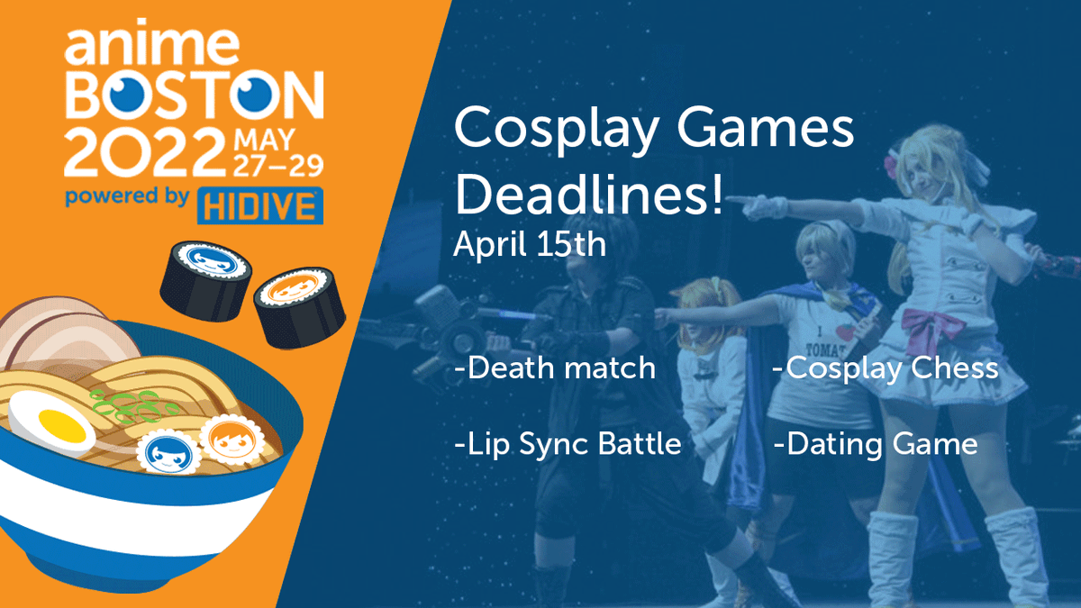 Perform as your favorite characters on stage in our #Cosplay Games: Death Match, Lip Sync Battle, Chess, and Dating Game. Sign ups open through 4/15 bit.ly/cosplayappab22 #AnimeBoston #AnimeBoston2022