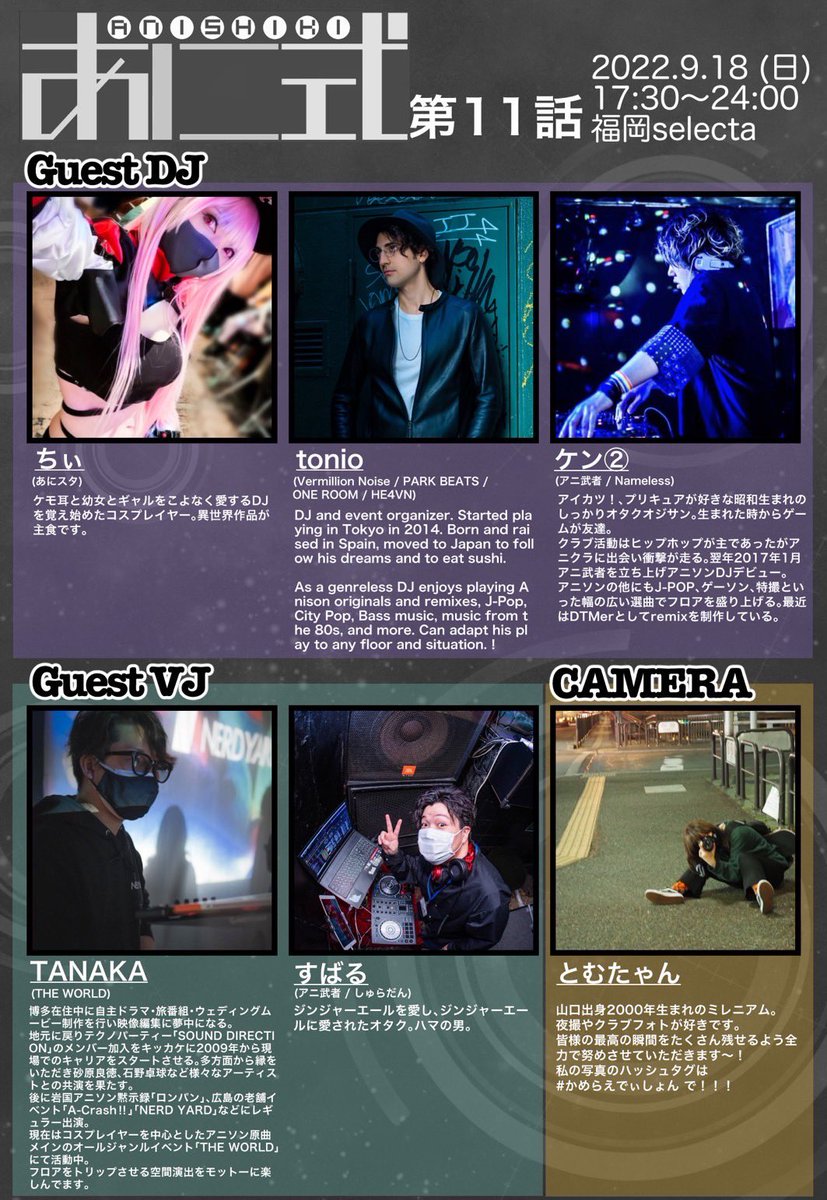 19 15 #あに式 予約スタート! 今回も各地からゲストをお呼びしての開催!そしてレギュラー陣も久々のフルメンバー参加です! 【#あに式 第11話】 ■2022.9.18(日) ■17:30-24:00 ■#福岡セレクタ ■2500円(1ドリンク付) ■コスプレ参加500円割引 予約はこちらから(80名まで) select-type.com/rsv/?id=JeTrkB… 22/09/11 18:30