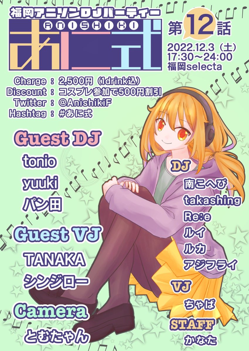 10 5 ✨12/3あに式 お知らせ✨ スタッフとして政(@mirage_joker )さんが参加❗️ そして今回こそはレギュラー陣も久々のフルメンバー参加‼️ 忘年会気分で遊びに来てください‼️🍻 #あに式 第12話 ■2022.12.3(土) ■17:30〜24:00 ■#福岡セレクタ ■2500円(1dr付) ※コスプレ参加500円OFF 22/11/25 12:30