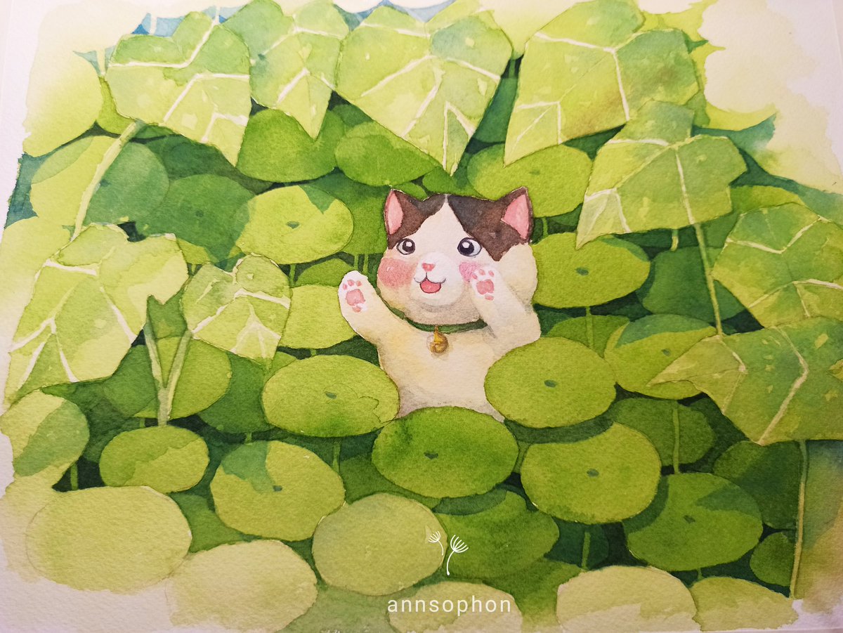 ต๊ะเอ๋ ❤️ ปลูกใบบัวบกเสร็จแย้วววว วาดลูกต๋า V2 ไปวิ่งเล่นบนดาวแมวก็คงแฮปปี้ฟีลนี้ คิดถึง 🥰 #aiannart #watercolor