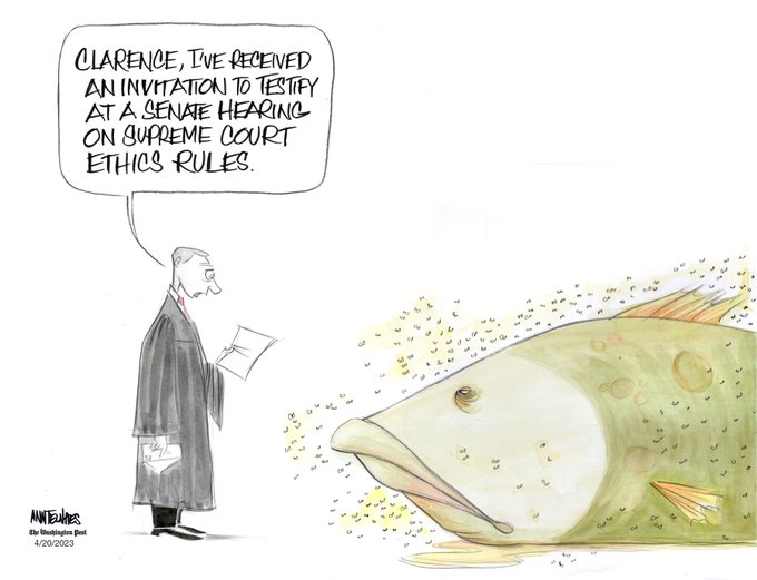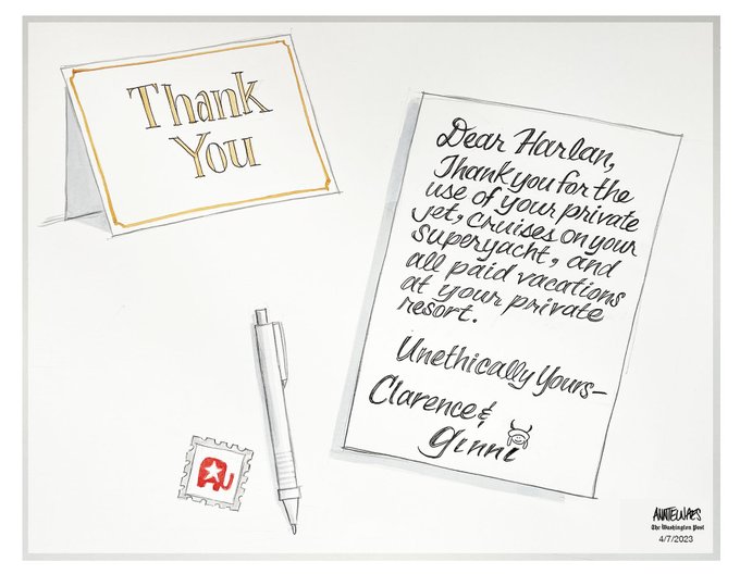 Luxe and bagels While Supreme Court Justice Clarence Thomas and his wife didn’t see the need to disclose luxury vacations and other gifts from Harlan Crow, Justice Elena Kagan didn’t want to accept a gift basket of bagels. washingtonpost.com/opinions/2023/…