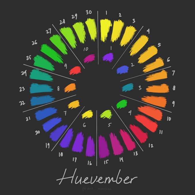 The color prompts that I'll use for #huevember2022 The outer number is for 30 illustrations, and the inner number is for 10 illustrations. I also added complementary colors (the inner circle) Feel free to use