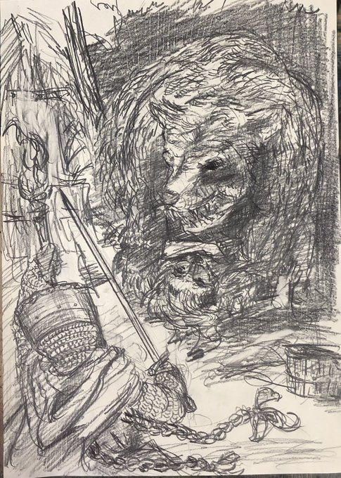 過去にあった🐻に関する話を聞いたら怖くなってきたので、ウチの騎士と対峙するスケッチを描いてみました(>_<)