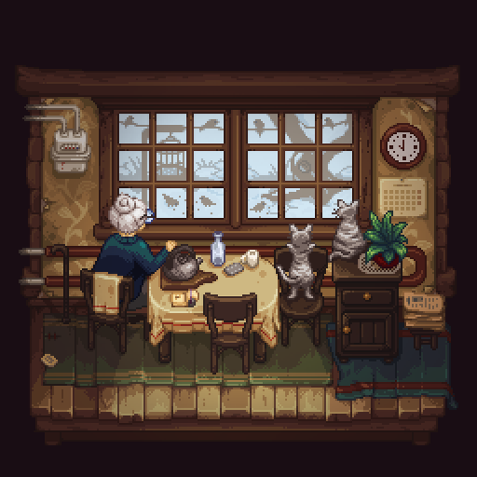 Our Granny and cats are watching the birds outside the window🐱 One more artwork inspired by the works of @arthur_vista #pixelart #pixelartist #ドット絵