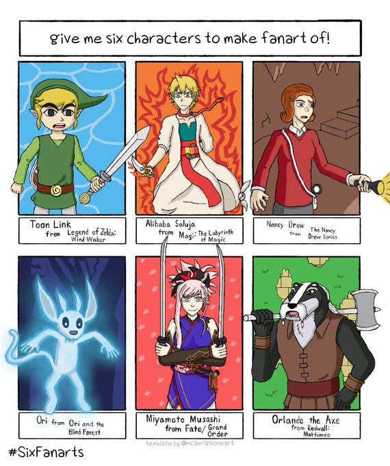 So I did the 6 Fanarts Challenge, where I tried to draw characters I never drew before, and come from a variety of art styles. Toon Link and Nancy Drew were both suggested to me, the rest are characters from things I liked. #SixFanarts #sixfanartchallenge #6fanartschallenge