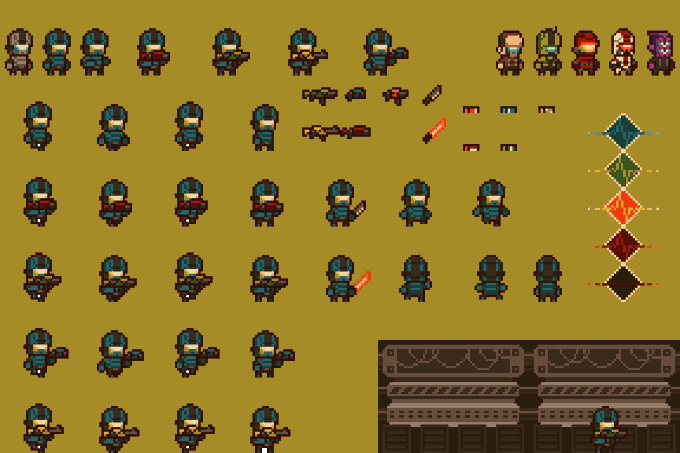 3 5 First sprite sheet for a sci-fi survival horror metroidvania I've been thinking about #pixelart | #gameart | #scifi | #horror | #metroidvania 22/11/28 16:45
