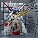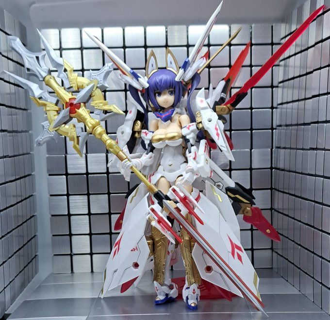 1 4 武器はパワーアップ前のメイン武器(太刀)に新パーツと新武器(アルナイルロッド)を合体させたもの・・・なんだけど、デカすぎた!ウチの小さい撮影ブースに収まらない #メガミデバイス 23/01/29 22:54