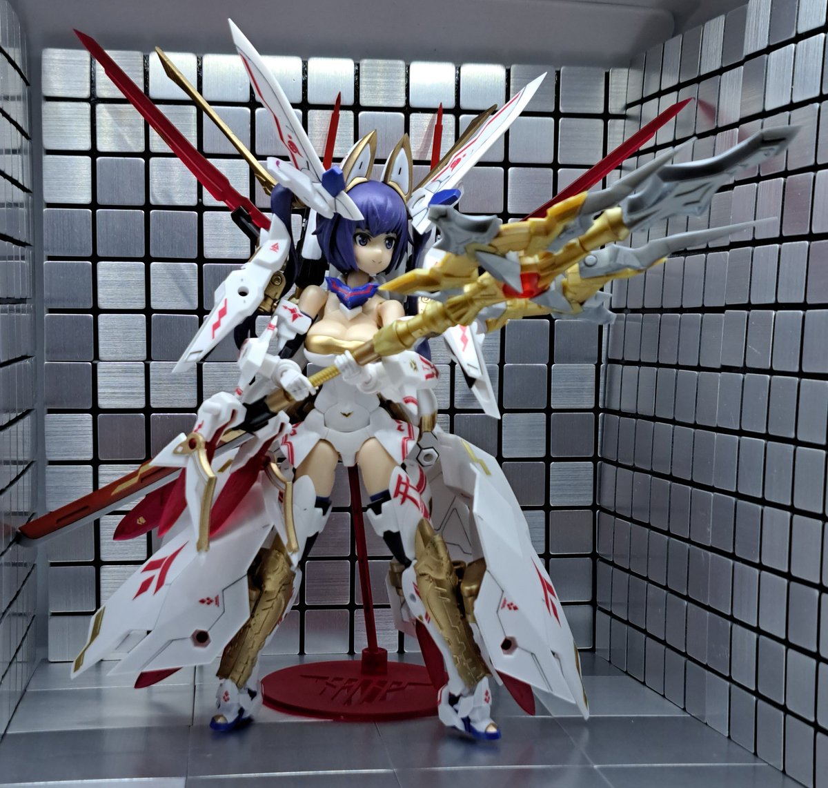 武器はパワーアップ前のメイン武器(太刀)に新パーツと新武器(アルナイルロッド)を合体させたもの・・・なんだけど、デカすぎた!ウチの小さい撮影ブースに収まらない #メガミデバイス