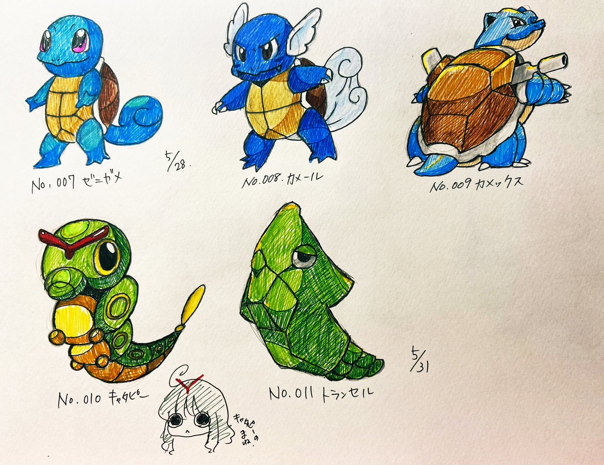 7 25 #くお生 今日はカメールからトランセルまで描きました。 トランセル70cmあるってマ?こわ。 22/06/01 00:08