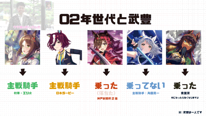 この前武豊騎手が2002年ぶりに全レース連対したそうですが、ここでウマ娘で武豊騎手と02年世代の関係性を見てみましょう。