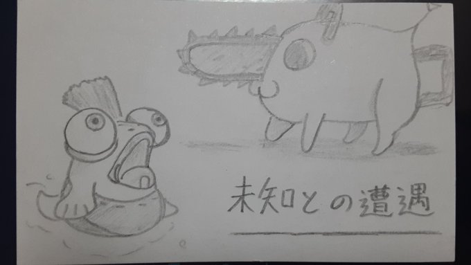 未知との遭遇 ~コジャケとポチタを添えて~ #チェンソーマン #スプラ3 #コジャケ #ポチタ #イラスト
