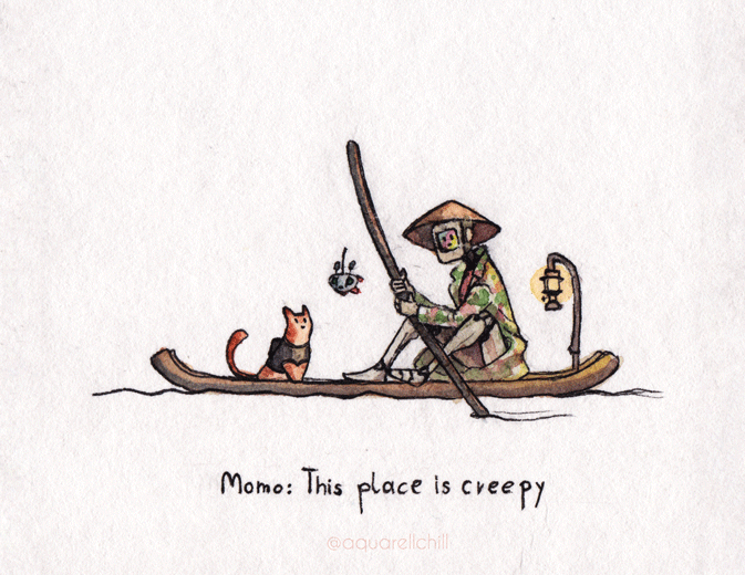 My first #Stray mini fanart! Cat, B12 and Momo on the boat (Actually made this few weeks ago) #straygame #strayfanart #straymomo #strayb12 #strayart #catgame #watercolor #artistsontwitter