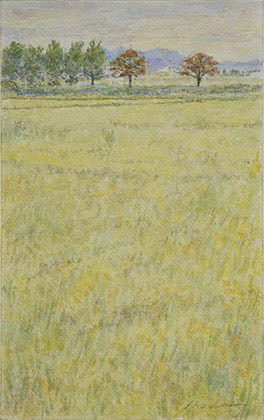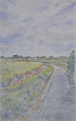 「稲田の秋」 収穫を待つ稲田と遊歩道。長い一年、今年も秋が来た。 #アクアレル画 #水彩画