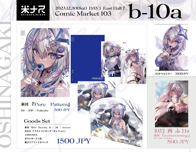 🔷C103お品書き🔷 12/30(土)東7ホール b-10a(Vtuber) 12/31(日)西1ホール ふ-11a(創作) 今回冬コミのお品書きです! 新刊二冊のメロン通販予約も始まりました! 🍈かなたん本「PurePattern」🍈 melonbooks.co.jp/detail/detail.… 🍈うちの子本「embarrassing」🍈 melonbooks.co.jp/detail/detail.…… twitter.com/i/web/status/1…