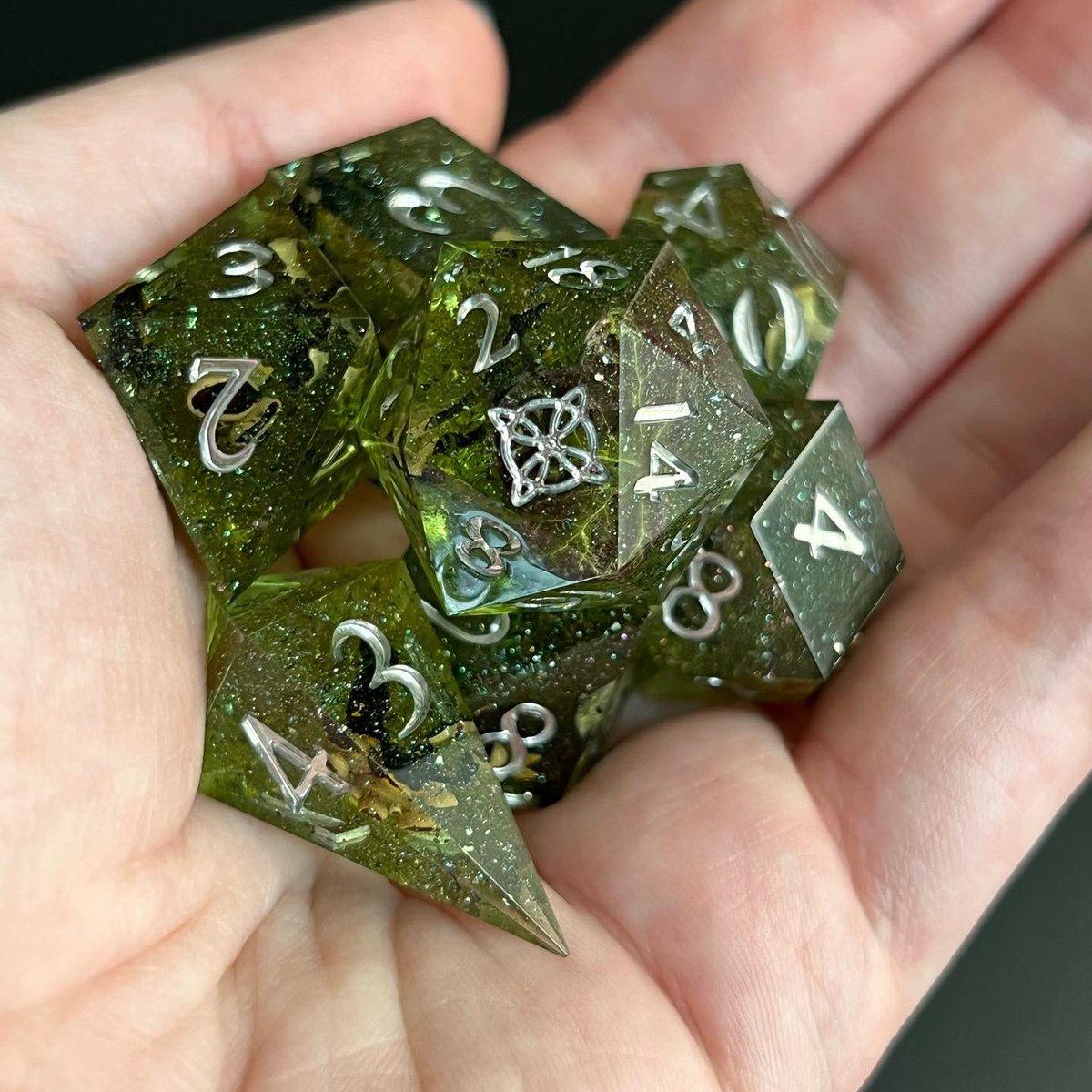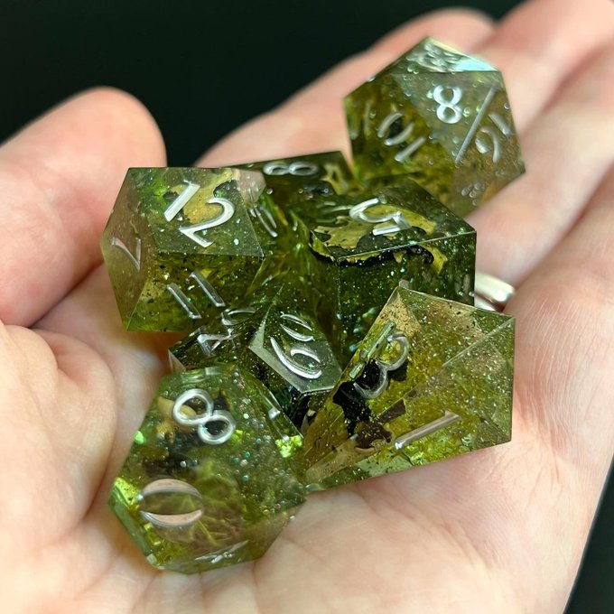 ‘Orym’ is a handmade set of shimmering sage green dice, with locally-foraged (PNW) reindeer moss, black lichen, and English ivy inclusions, and is inked in chrome. @CriticalRole @VoiceOfOBrien #criticalrolefanart #orym