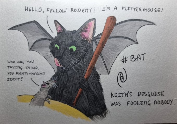 The prompt for Day 3 of #inktober2022 was #bat Flittermouse is a mostly archaic English word for bats. The word "bat" (whether applied to Flittermice OR offensive weapons/sport sticks) comes from a root word meaning "to strike"... #inktober #drawing #drawings #morestupidfacts