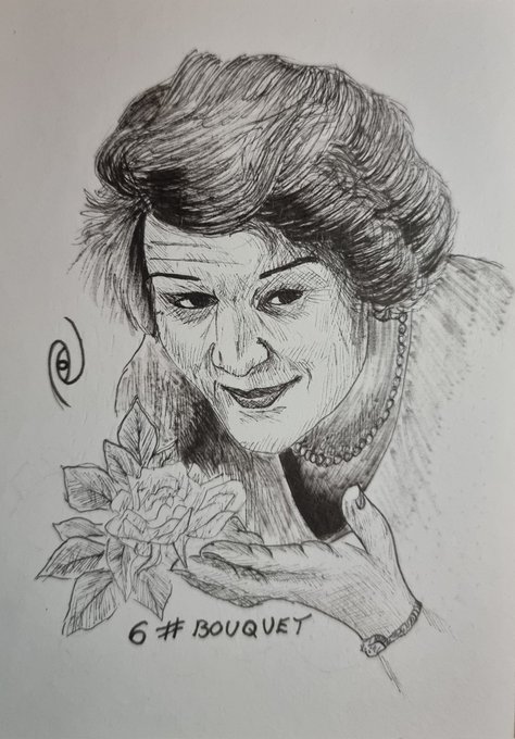 Day 6 of #inktober2022 already? A simple one tonight. The prompt was #bouquet and so... Who better to be Keeping Up Appearances than Hyacinth, the Bucket Woman, enjoying the bouquet of one of her roses...? #inktober #drawing #drawings #amdrawing