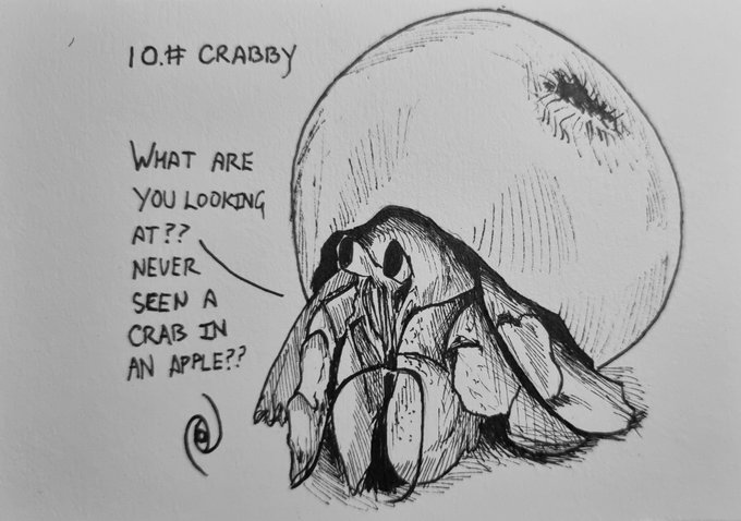 The prompt for Day 10 of #inktober2022 was #crabby and, let's face it, you can't get more crabby than a grumpy hermit crab living in a crab apple... #inktober #drawing #drawings #amdrawing