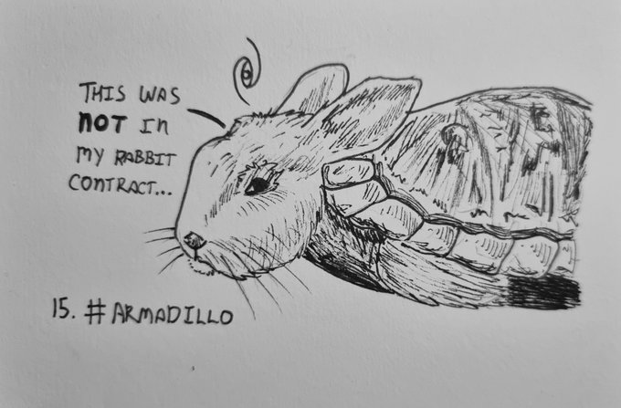 The prompt for Day 15 of #inktober2022 was #armadillo - so what's with the rabbit in a turtle shell, Evans? Well, Armadillo comes from Spanish and is a diminutive of "armoured" apparently... But the Aztecs called these little chaps "āyōtōchtli" which means "turtle rabbit" so...