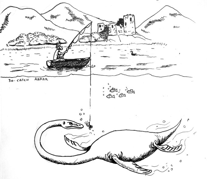 #inktober2019 #day30 Catch. Deep in the loch lives someting big. #lochness #lochnessmonster #monster #scotland #fishing #fisherman #nessie #lake #deepwater #dinosaur #sketch #inktober #pen #ink #catch instagram.com/p/B4QoaCRjWl4/